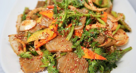 묵을 썰어 고춧가루와 간장, 설탕, 식초 등을 넣고 양파, 파, 고추, 새우, 계란 등과 함께 볶아내어 만드는 무침 요리입니다. 씹을 때 식감이 쫄깃하면서도 고소하고 매콤한 맛이 일품입니다.