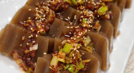 묵을 썰어 고춧가루와 간장, 설탕, 식초 등을 넣고 양파, 파, 고추, 새우, 계란 등과 함께 볶아내어 만드는 무침 요리입니다. 씹을 때 식감이 쫄깃하면서도 고소하고 매콤한 맛이 일품입니다.